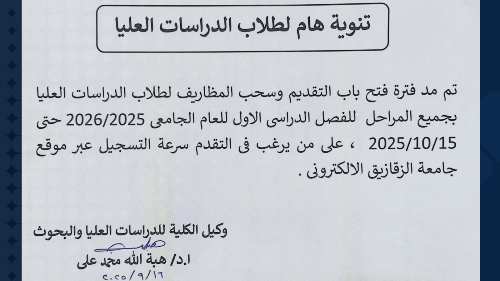 تم مد فترة التقديم وفتح المظاريف لطلاب الدراسات العليا بجميع المراحل للفصل الدراسى الأول لعام الجامعى 2025-2026 حتى 15-10-2025 على من يرغب بالتقديم سرعه التسجيل عبر موقع جامعه الزقازيق الإلكترونى .
